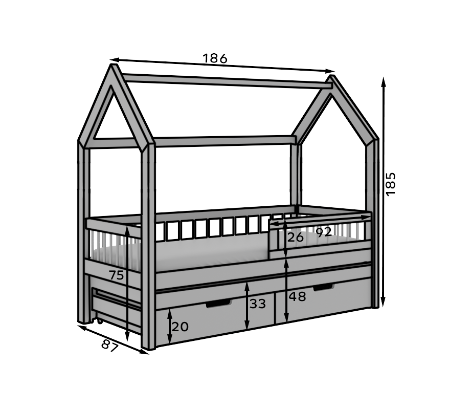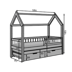 Leírás: Az **Artes Cottage ágy** stílusos és funkcionális megoldás olyan családok számára, akiknek fontos a praktikum és az esztétikum egyben. Ez egy kétszemélyes ágy, amelyet egy házikó formája ihletett, amely hangulatos és meleg hangulatot kölcsönöz a belső térnek. Egyedülálló kialakításának köszönhetően tökéletesen alkalmas gyermek- és tinédzserszobákba egyaránt, a pihenést és szórakozást elősegítő teret teremtve.Az ágy **kivehető matraccal** rendelkezik, amely két személy számára is kényelmes használatot tesz lehetővé – ideális az éjszakai vendégek vagy a szobán osztozó testvérek számára. Ezenkívül **praktikus fiókokkal** rendelkezik, amelyek további tárolóhelyet biztosítanak az ágynemű, játékok vagy egyéb kiegészítők számára, segítve a rendben tartást.