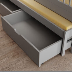 Ha a gyerekszobában kevés a hely, a tárolós megoldások aranyat érnek. Az ágyneműtartós gyermekágy vagy a fiókos kialakítás könnyíti a mindennapokat: elférnek benne az extra takarók, a szezonális ruhák, vagy akár a nagyobb játékok is. A rejtett tároló nemcsak praktikus, hanem vizuálisan is “rendet teremt”, mert kevesebb holmi marad szem előtt.