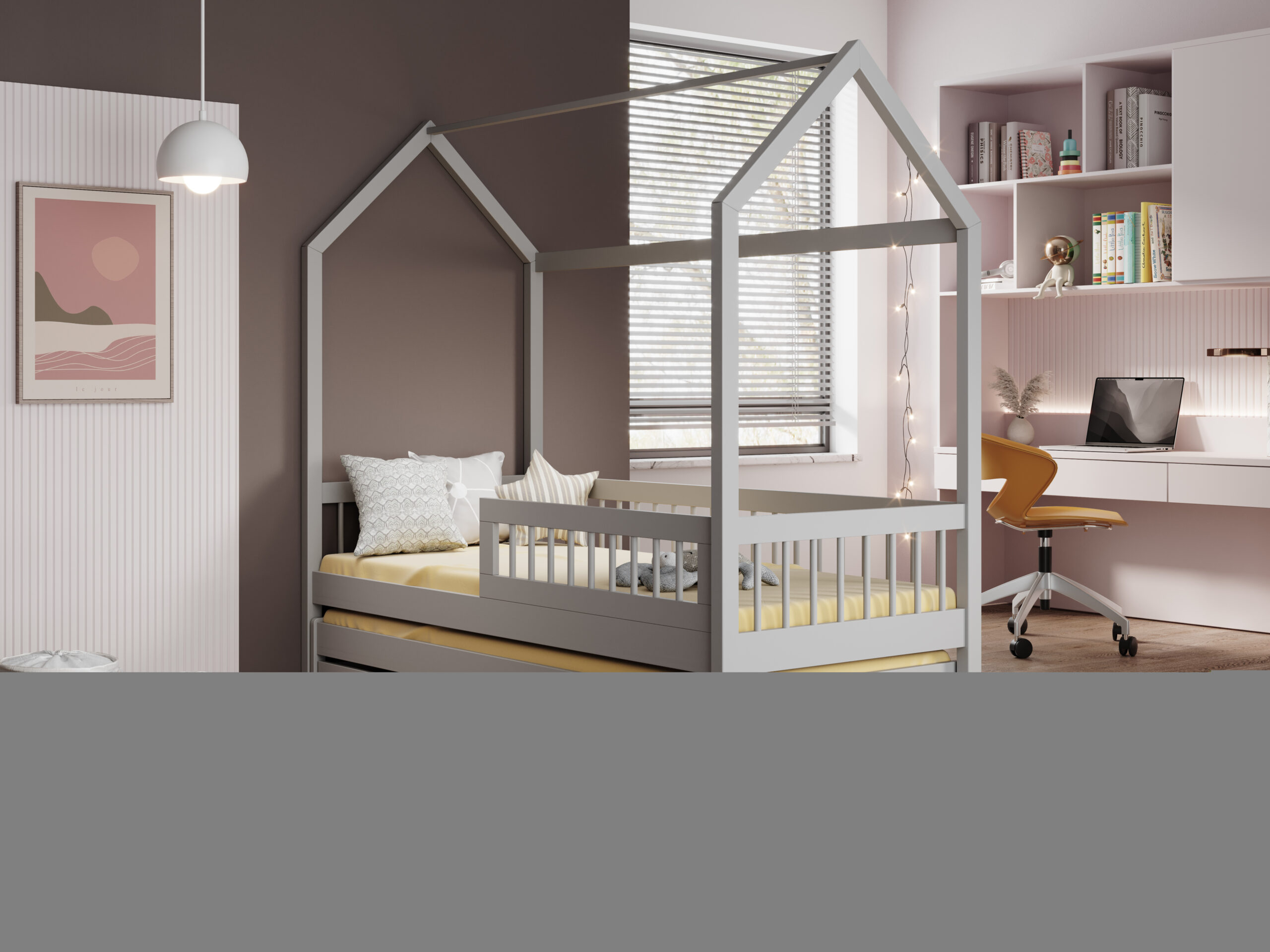 Ha szereted a skandináv, világos stílust: a fehér vagy világos fa jellegű fa házikó ágy remek alap. Ha inkább modern, “komolyabb” gyerekszobát szeretnél: a szürke vagy grafitszürke tónusok sokáig vállalhatók, akár tinédzser korban is. A fenyő árnyalat pedig természetesebb, otthonosabb atmoszférát hoz, különösen meleg fényű lámpákkal.