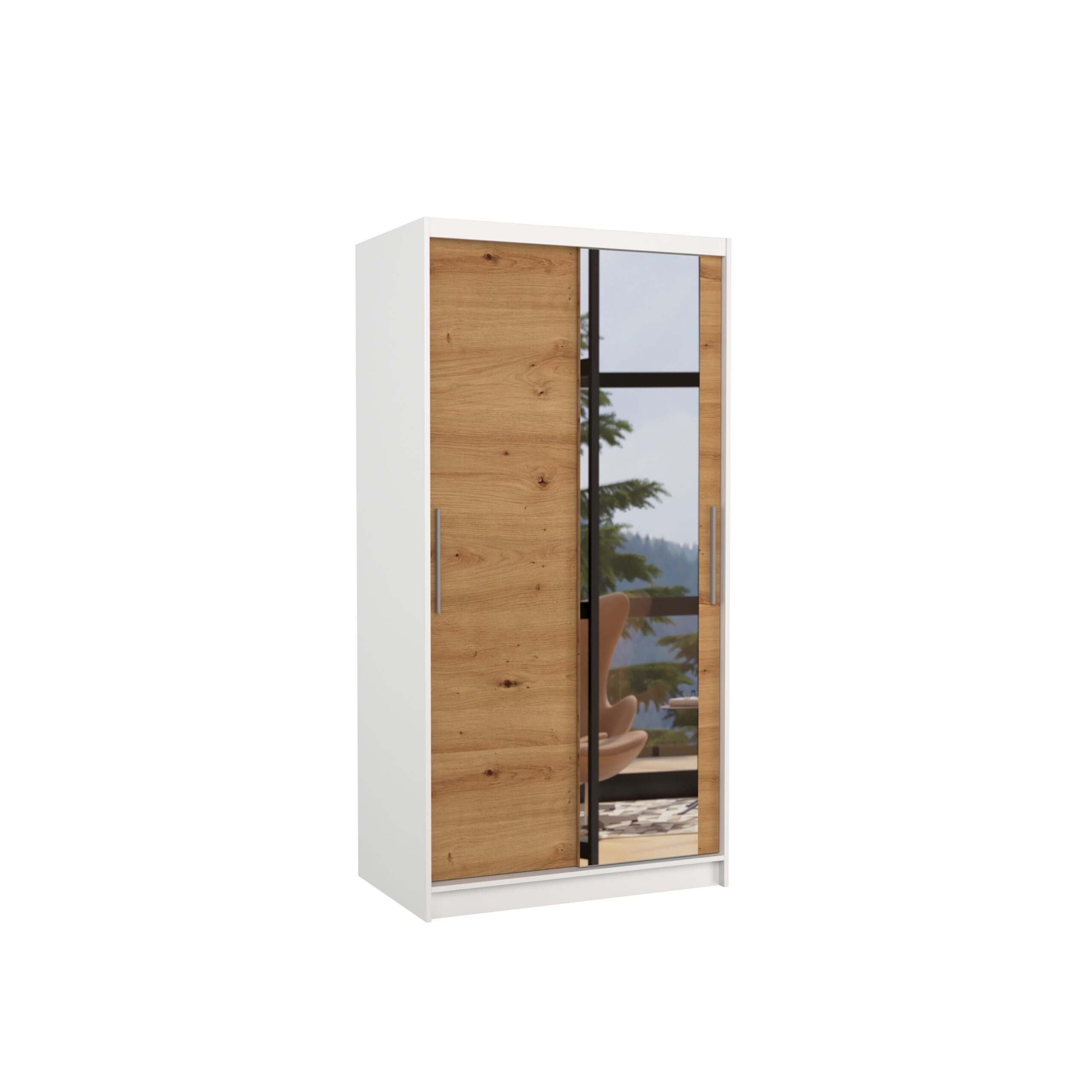 Leírás: A BAROS tolóajtós szekrény tükörrel tökéletes megoldás a tér rendezésére. A bútor tágas polcokkal és ruhásszárítóval van felszerelve, ahol fel tudod akasztani ruháidat, öltönyeidet, külső ruházatodat vagy ingeidet. Az előlapján elhelyezett tükör optikailag nagyobbá teszi a teret. A tolóajtós kialakításnak köszönhetően nem szükséges külön helyet szánni az ajtónyitásra, így tökéletes megoldás kis szobák vagy keskeny előszobák számára.