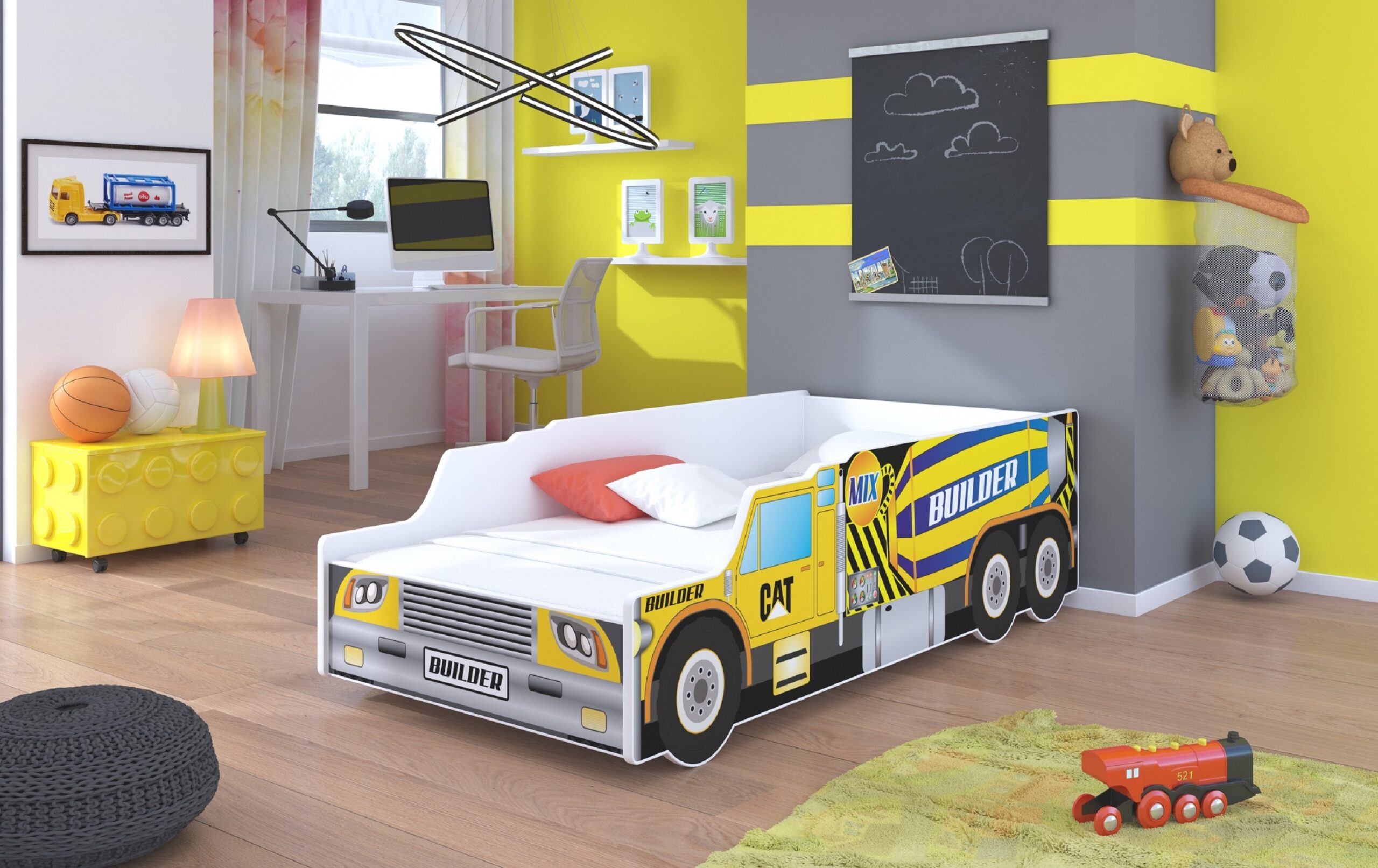 Leírás: Az egy személyes BUILDER ágy ideális választás kis autórajongók számára. A gyártási folyamat során környezetbarát vízbázisú festékeket használtak, amelyek biztonságosak és mechanikai sérülésekre is ellenállóak. Emellett az ágy élei nem élesítettek, és a grafika laminált bevonattal van védve.