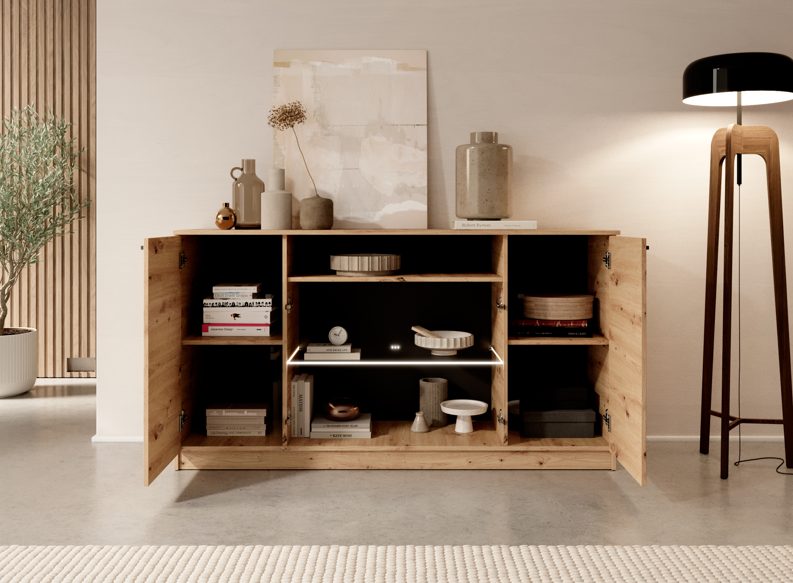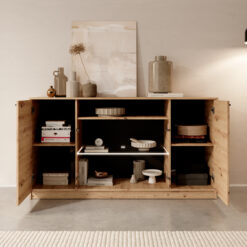 Ha többféle funkciót szeretnél egyetlen bútordarabban megoldani, segít, ha zónákban gondolkodsz. Például az egyik polcszint lehet „vendég zóna”, ahol a különlegesebb készletek vagy dekorációk kapnak helyet, míg egy másik szint a hétköznapi használatot szolgálja. A zárt részekbe kerülhetnek olyan dolgok, amelyeket nem szeretnél állandóan szem előtt tartani, de fontos, hogy kéznél legyenek. Ezzel a módszerrel a bútor nem válik zsúfolttá, és az összkép is rendezett marad.