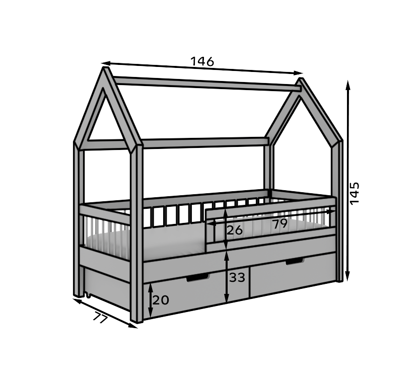 Leírás: A Galicia házikó ágy egy egyedi bútordarab, amely ötvözi a funkcionalitást és a hangulatos skandináv esztétika által inspirált dizájnt. A tömör fából készült ágy stabilitást és tartósságot biztosít, miközben meleg, természetes bájt kölcsönöz a belső térnek. A házikó formájú kialakítás serkenti a gyermeki fantáziát, hangulatos helyet teremtve a játékhoz és a pihenéshez. Ideális a gyermekszoba központi elemeként, kényelmes alvást biztosítva és kreatív játékra inspirálva. Az egyszerű forma és a természetes kivitel azt jelenti, hogy a Galicja ágy harmonikusan illeszkedik bármilyen enteriőrbe, függetlenül az elrendezés stílusától.