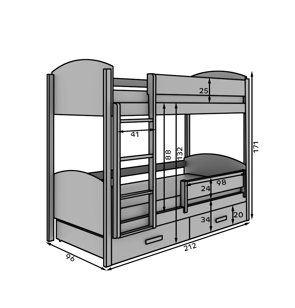 Leírás: A Jori emeletes ágy kiváló választás azon szülők számára, akik funkcionális és stílusos megoldást keresnek a gyerekszobába. Átgondolt kialakításának köszönhetően nemcsak kényelmes alvóhelyet biztosít két gyermek számára, hanem extra tárolóhelyet is kínál. Az alsó ágy alatt elhelyezett két tágas fiók tökéletes helyet nyújt ágyneműk, játékok, ruhák vagy egyéb gyerekholmik számára, segítve a rend fenntartását a szobában. A Jori ágy modern dizájnt ötvöz a magas színvonalú kivitelezéssel, így hosszú éveken át megbízhatóan szolgál. Masszív szerkezete és biztonságos, lekerekített élei kényelmet és védelmet nyújtanak a legkisebbek számára is. Ez az ágy tökéletesen megállja a helyét akár fiú-, akár lányszobában, barátságos és funkcionális légkört teremtve a belső térben.