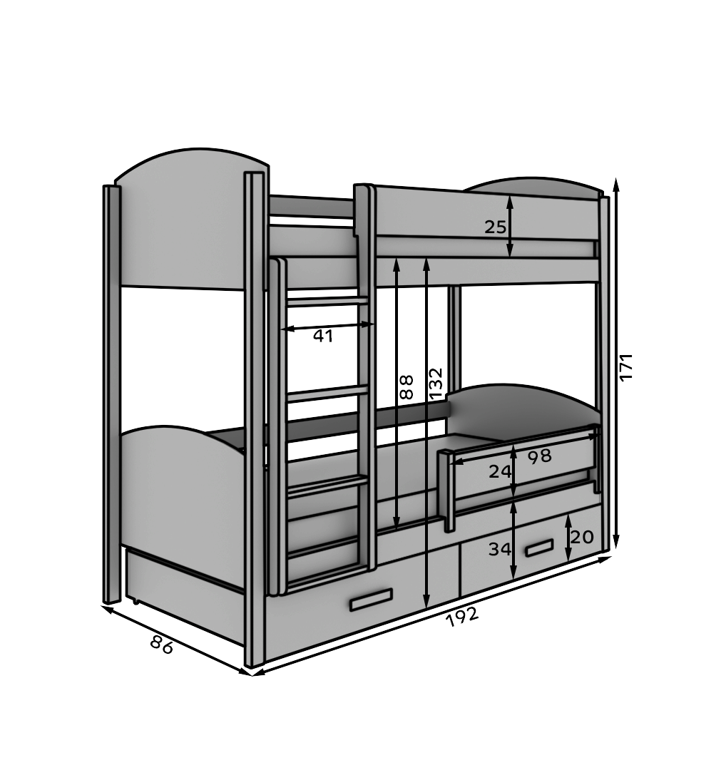Leírás: A Jori leesésgátlós emeletes ágy kiváló választás azon szülők számára, akik funkcionális és stílusos megoldást keresnek a gyerekszobába. Átgondolt kialakításának köszönhetően nemcsak kényelmes alvóhelyet biztosít két gyermek számára, hanem extra tárolóhelyet is kínál. Az alsó ágy alatt található két tágas fiók ideális helyet nyújt ágyneműk, játékok, ruhák vagy más gyerekholmik számára, segítve a szoba rendben tartását. A Jori ágy leesésgátlóval modern dizájnt ötvöz kiváló minőségű kivitelezéssel, így hosszú éveken át megbízható társa lesz a családnak. Masszív szerkezete és biztonságos, lekerekített élei kényelmet és védelmet nyújtanak a kicsiknek, míg a plusz védőkorlát nyugodt alvást biztosít, kizárva a kiesés veszélyét. Ez az ágy tökéletes választás fiú- és lányszobába egyaránt, barátságos és funkcionális hangulatot teremtve a belső térben.