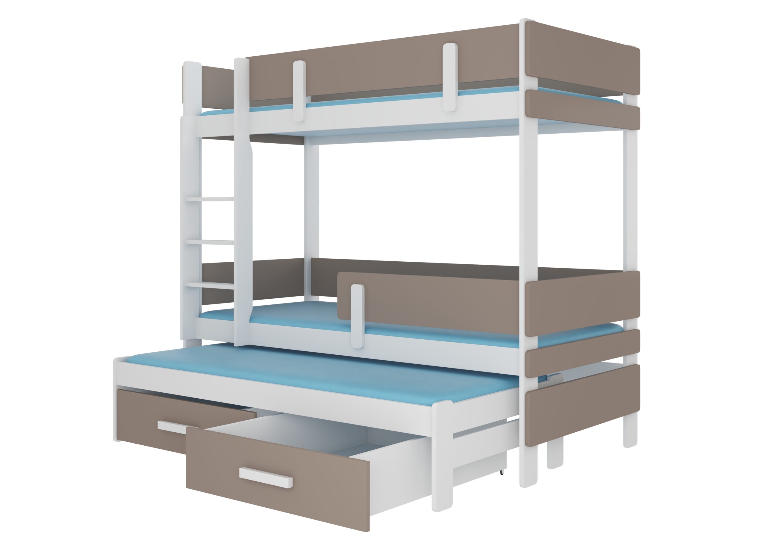 Leírás: Az ETAPO háromszemélyes emeletes ágy kiváló megoldás a helytakarékosságra egy kis gyerekszobában. A bútor létrás lépcsővel és két tágas, funkcionális ágyneműtartó fiókkal rendelkezik. Ezenkívül mindkét szinten korlátok vannak felszerelve, amelyek növelik a biztonságot alvás közben. Az ágyhoz nem tartozik matrac.