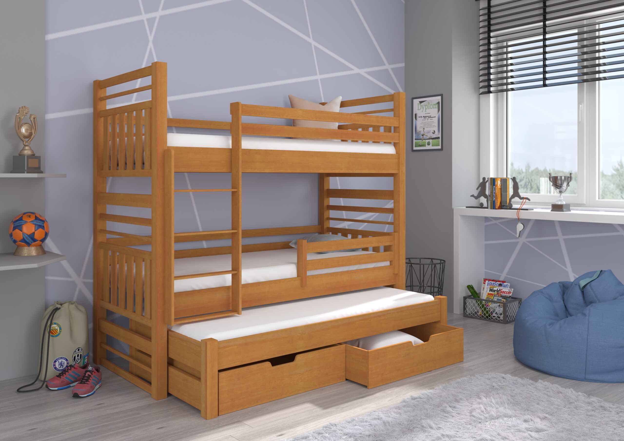 Emeletes ágy Háromszintes emeletes ágy HIPPO 200×90 – éger