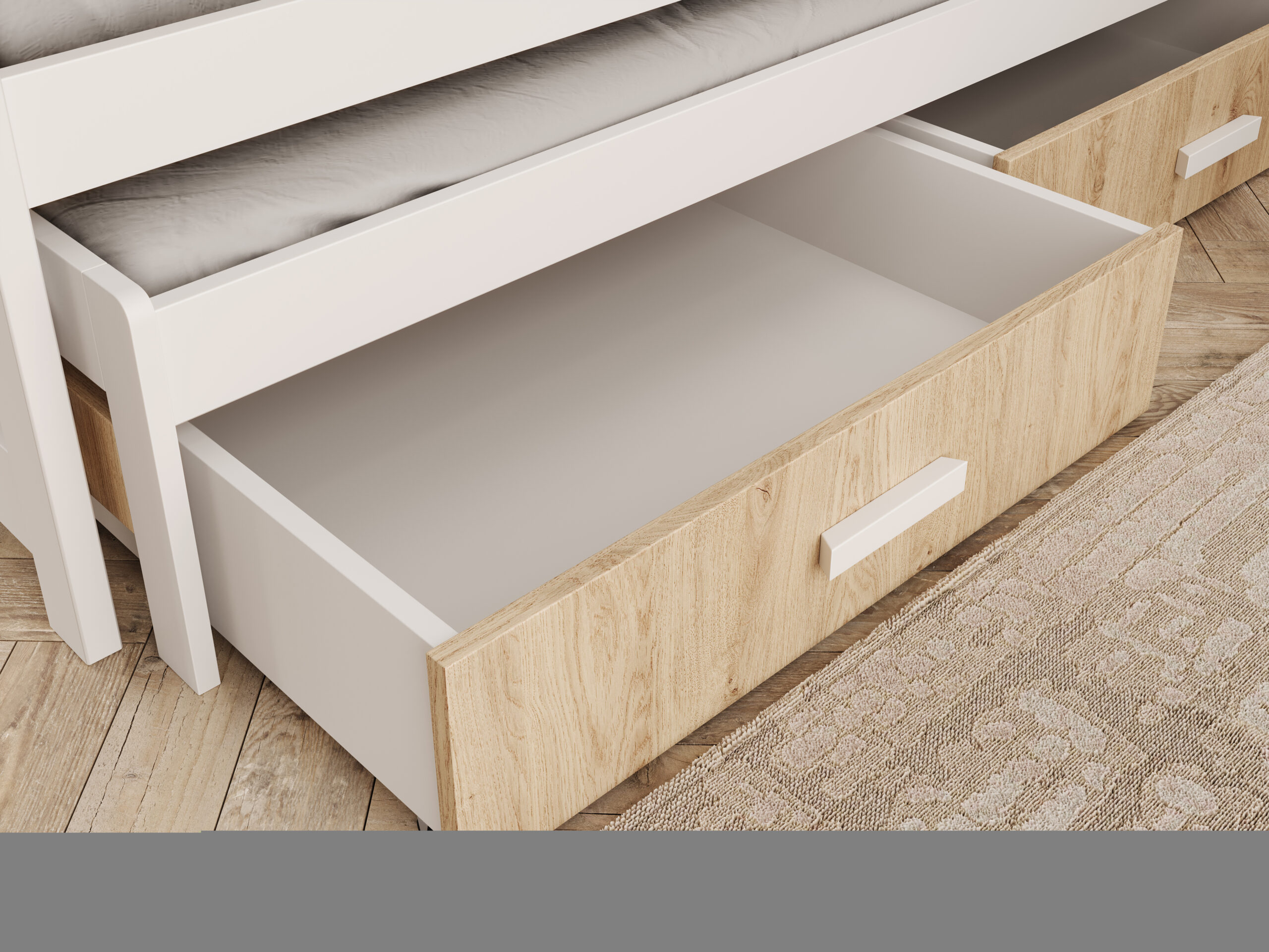 Éjjeli fény, leesésgátló (ha nincs), tárolódobozok/fiókrendezők, és egy jó matrac vagy topper.