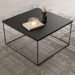 Elegáns, két részből álló dohányzóasztal szett fekete asztallappal és arany fémvázzal. Könnyedén egymás alá tolható elemei praktikusak és helytakarékosak, miközben stílusos központi elemként szolgálnak egy modern nappalibanacél vázas dohányzóasztal famintás fedlappaldohányzóasztal szett fémvázas famintás asztal lappal