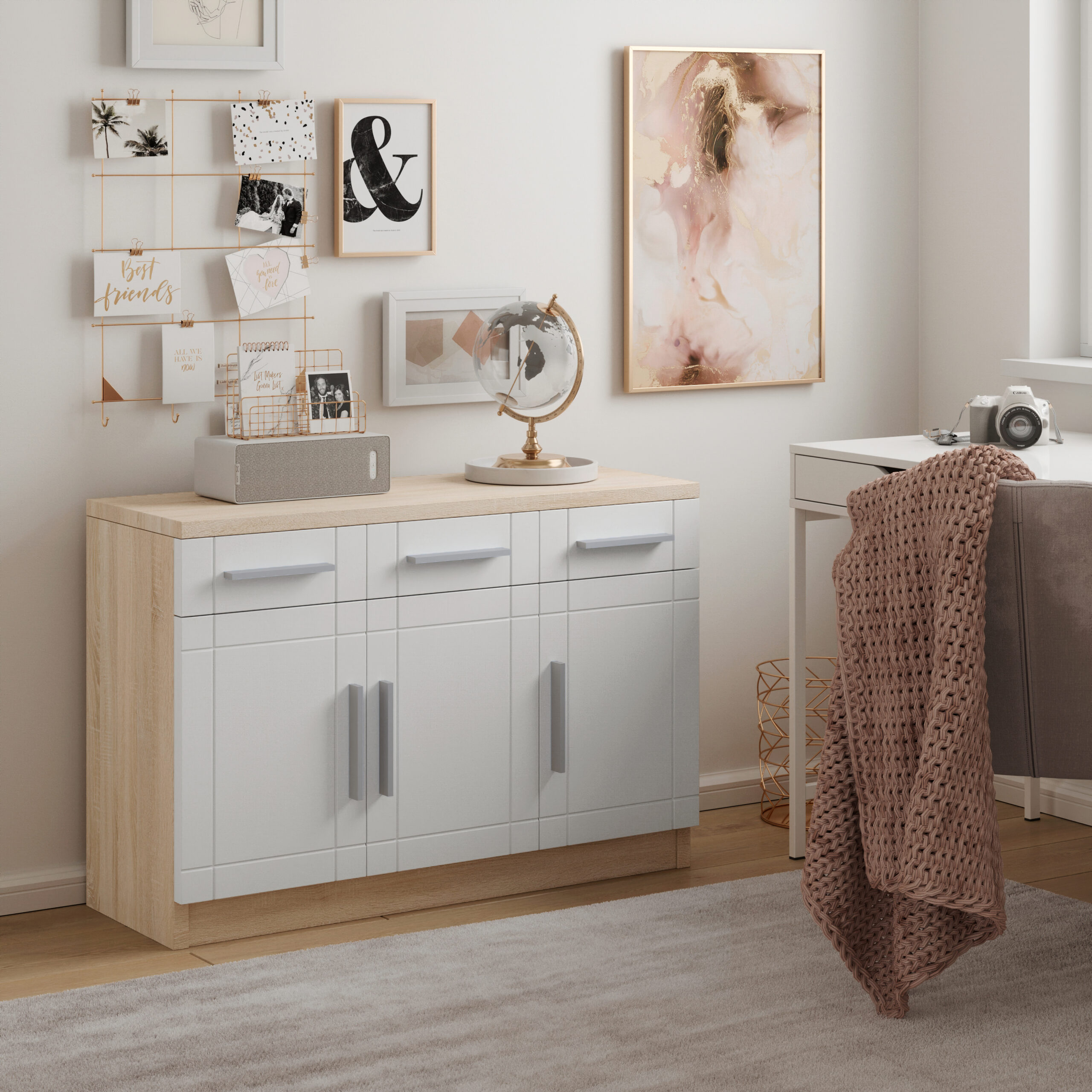 Leírás: Az érdekes kialakítású PARVIN komód ideális a nappaliba, hálószobába vagy előszobába. Praktikus és funkcionális. Három tágas fiókja lehetővé teszi a kisebb tárgyak vagy dokumentumok tárolását, a középen polccal ellátott szekrények pedig további helyet biztosítanak.