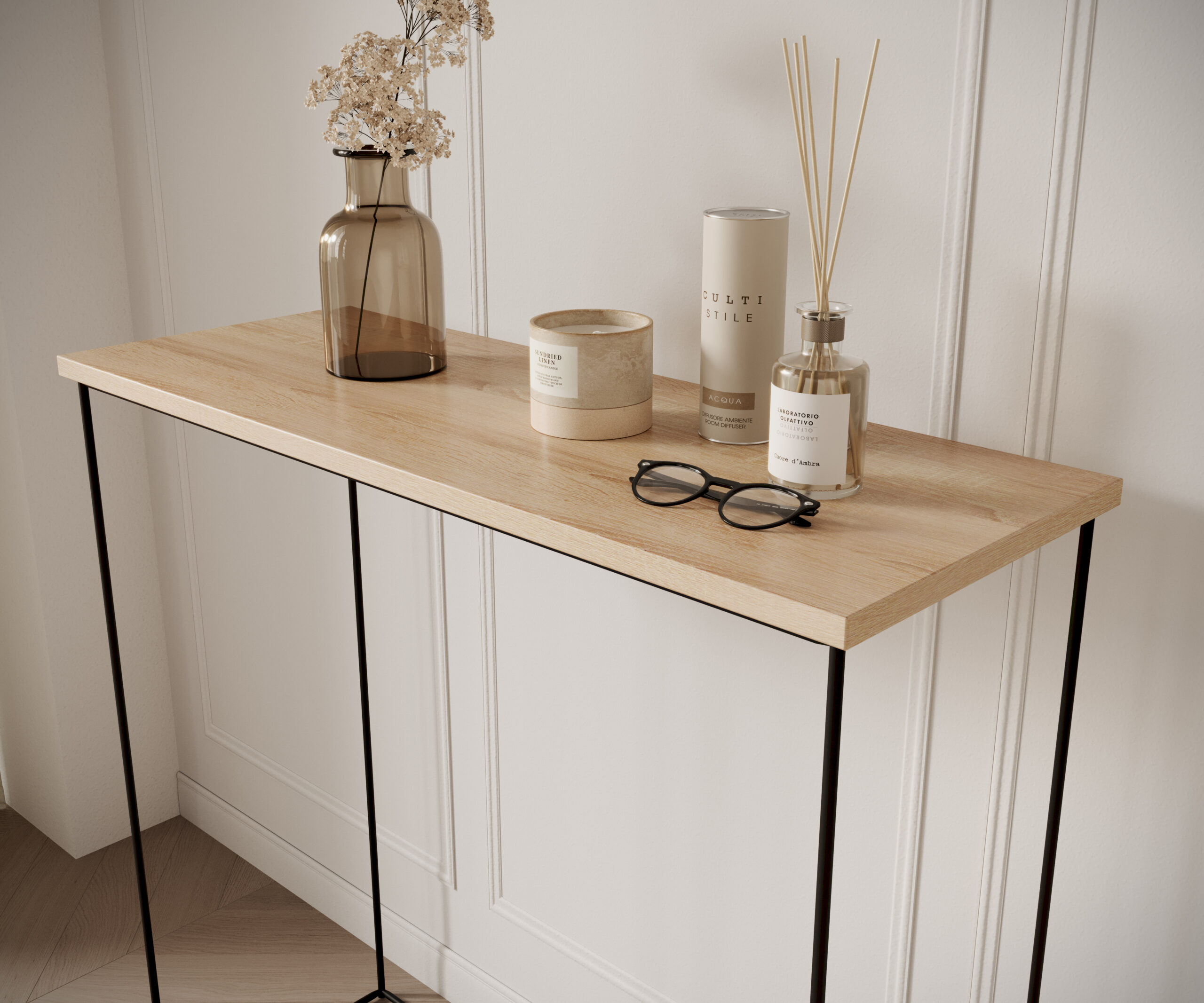 Például ha fekete kilincseid vagy fekete lámpatestek vannak, egy fekete vázas konzol nagyon „odatalál” a térbe. Ha világos, skandináv jellegű otthonod van, a fehér váz és a világos felület könnyen beleolvad, és nem nyomja össze a teret. Elegánsabb enteriőrben a melegebb tónusok, a finom arany részletek és a semleges dekor jól működnek.