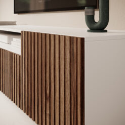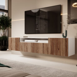 Az alacsony komód jellegű TV bútorok nagy előnye, hogy optikailag nyugodtabbá teszik a teret. Különösen akkor előnyösek, ha nagy képernyős tévét használsz, vagy a falon van a TV, és alá szeretnél egy hosszú, elegáns felületet dekorációknak, hangprojektornak vagy hangfalaknak. Egy alacsony, széles bútor stabil alapot ad, és segít „összefogni” a nappali látványát – mintha a TV fal saját kompozíciót kapna.