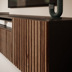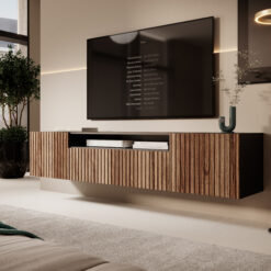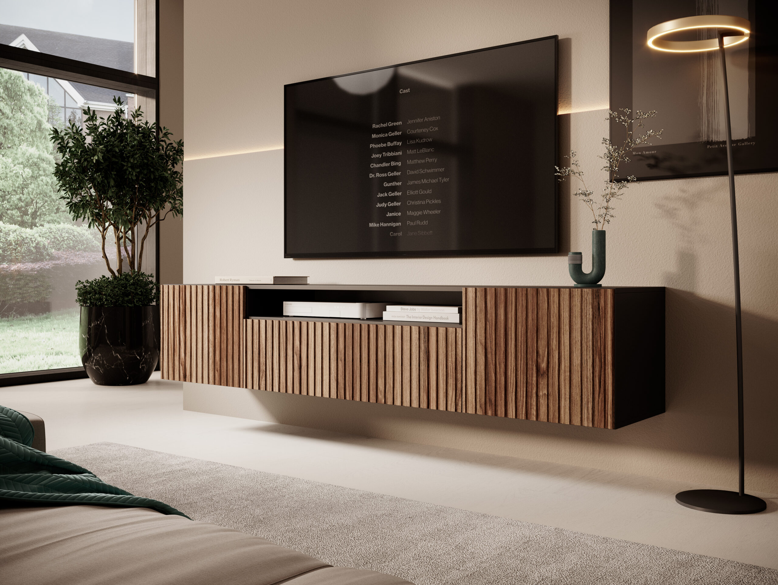 Az alacsony komód jellegű TV bútorok nagy előnye, hogy optikailag nyugodtabbá teszik a teret. Különösen akkor előnyösek, ha nagy képernyős tévét használsz, vagy a falon van a TV, és alá szeretnél egy hosszú, elegáns felületet dekorációknak, hangprojektornak vagy hangfalaknak. Egy alacsony, széles bútor stabil alapot ad, és segít „összefogni” a nappali látványát – mintha a TV fal saját kompozíciót kapna.