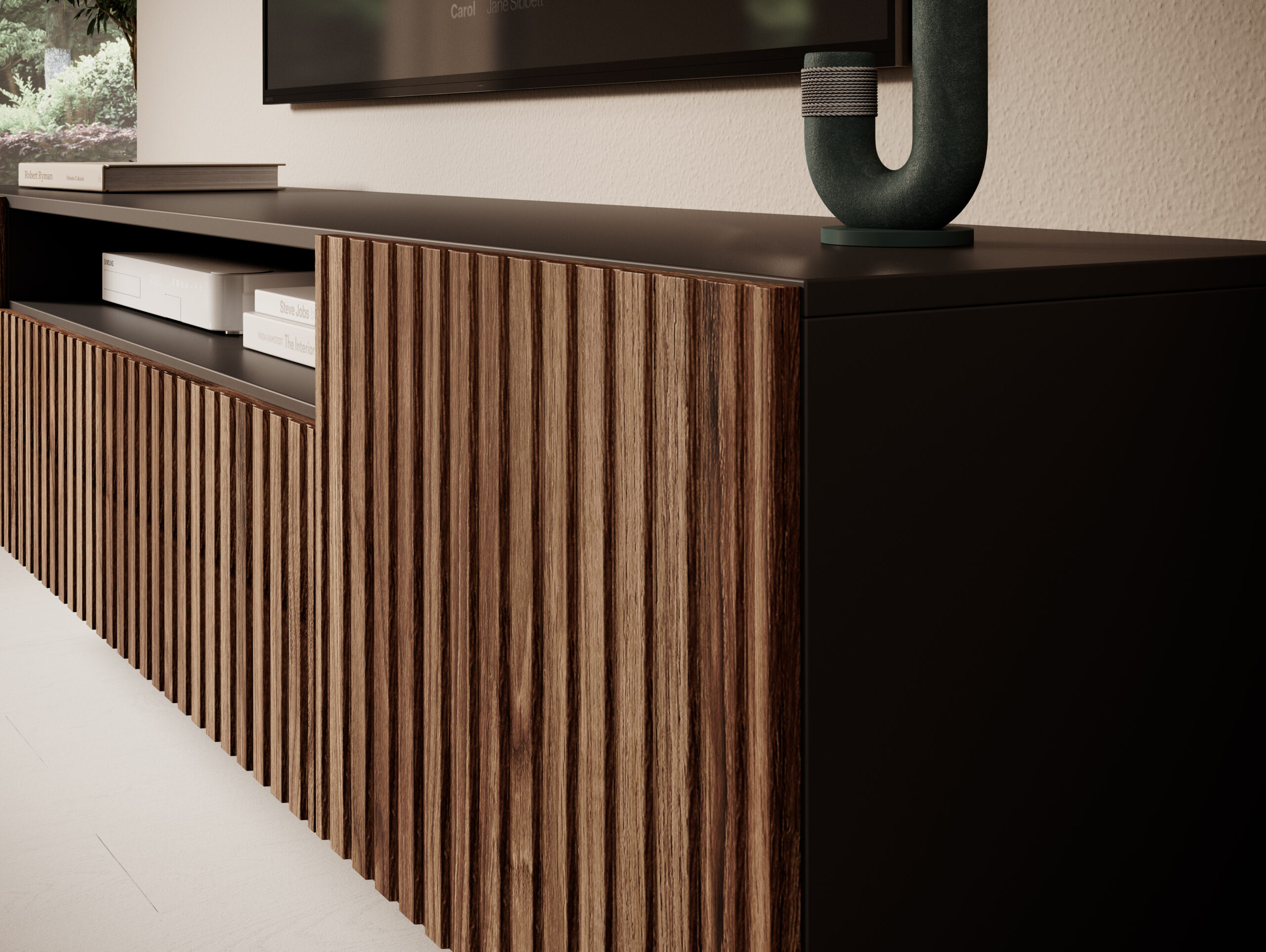 Nagyobb térben a TV fal gyakran „színpad”, ahol a bútor a dizájn része. Ilyenkor érdemes szélesebb megoldást választani, ami arányos a képernyővel és a fallal. A hosszabb TV komód harmonikusan vezeti a tekintetet, és lehetőséget ad dekorációra, növényekre, hangulatfényre. A minőségi felület és a karakteres front (például strukturált vagy fa hatású elem) látványban sokat emel az összképen.