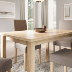 A fa hatású étkező asztal szinte mindenhez passzol: fehér, bézs, szürke, fekete kárpitokkal is jól működik, így az ülőbútor lehet az, amivel finoman változtatsz a hangulaton. Merészebb megoldás, ha az ülőfelület adja a színt (például zöld, kék, terrakotta árnyalat), és az asztal marad semleges.