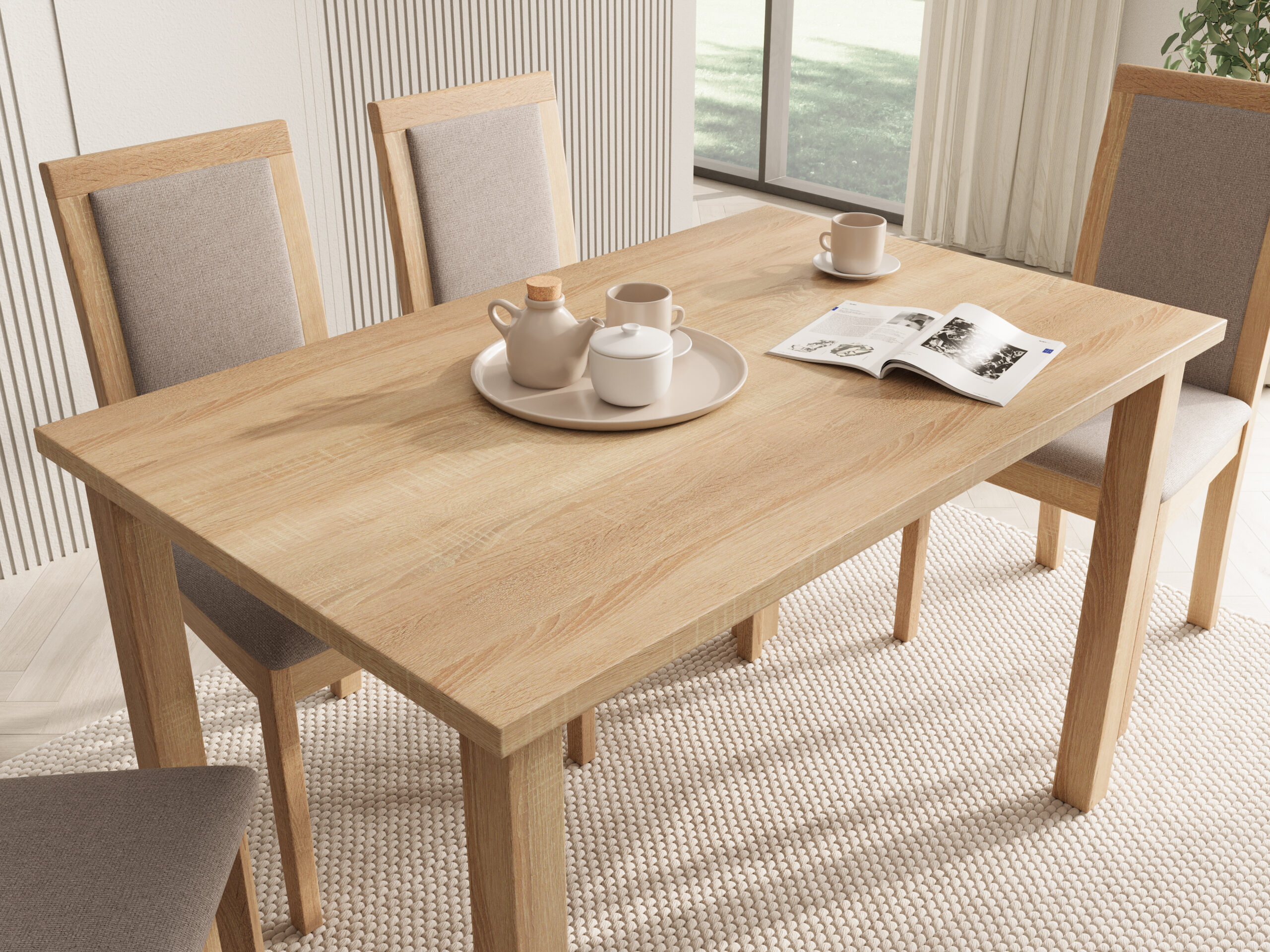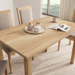 A fa hatású étkező asztal szinte mindenhez passzol: fehér, bézs, szürke, fekete kárpitokkal is jól működik, így az ülőbútor lehet az, amivel finoman változtatsz a hangulaton. Merészebb megoldás, ha az ülőfelület adja a színt (például zöld, kék, terrakotta árnyalat), és az asztal marad semleges.