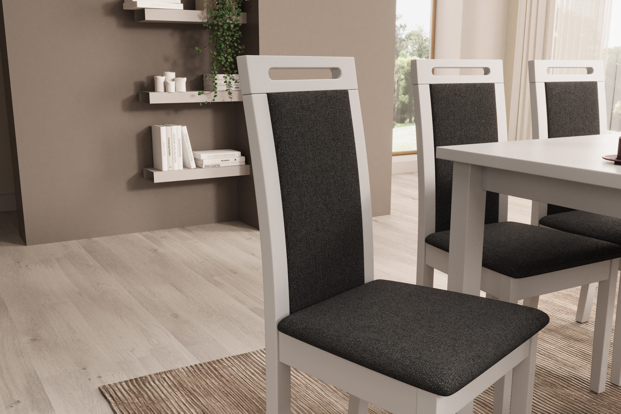 A fekete színű ülőhelyek az egyik legsokoldalúbb választások: világos fa asztallal kontrasztos és modern, sötétebb asztallal pedig elegáns és összefogott. Ha szereted a letisztult, prémium hatást, ez egy stabil “alap”, amit könnyű világítással és kiegészítőkkel felöltöztetni.