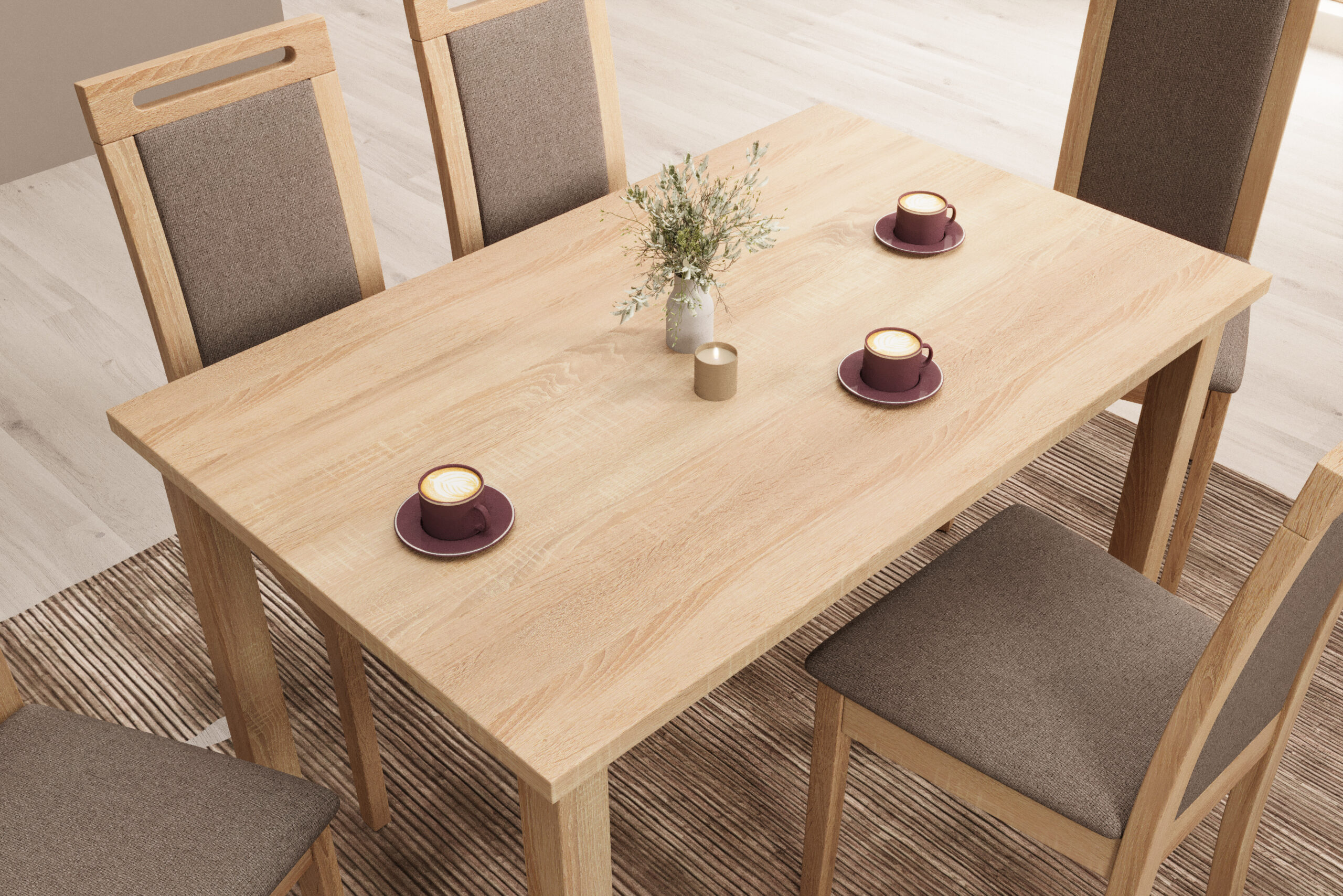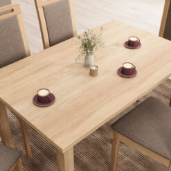 A fa hatású étkező asztal szinte mindenhez passzol: fehér, bézs, szürke, fekete kárpitokkal is jól működik, így az ülőbútor lehet az, amivel finoman változtatsz a hangulaton. Merészebb megoldás, ha az ülőfelület adja a színt (például zöld, kék, terrakotta árnyalat), és az asztal marad semleges.