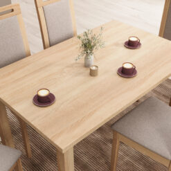 A fa hatású étkező asztal szinte mindenhez passzol: fehér, bézs, szürke, fekete kárpitokkal is jól működik, így az ülőbútor lehet az, amivel finoman változtatsz a hangulaton. Merészebb megoldás, ha az ülőfelület adja a színt (például zöld, kék, terrakotta árnyalat), és az asztal marad semleges.