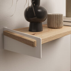Skandináv terekben a világos fa árnyalatok és a fehér fal a nyerő: itt egy letisztult lebegő polc kevés tárggyal nagyon elegáns. Modern-minimal lakásokban a polc lehet sötétebb, grafitos vagy fekete részletekkel – a kontraszt adja a karaktert. Természetes, meleg stílusban a fa hatású felületek (tölgy/sonoma/artisan jelleg) harmonizálnak legjobban, és a polcon jól mutatnak a natúr textúrák, kerámiák, fonott kosarak.