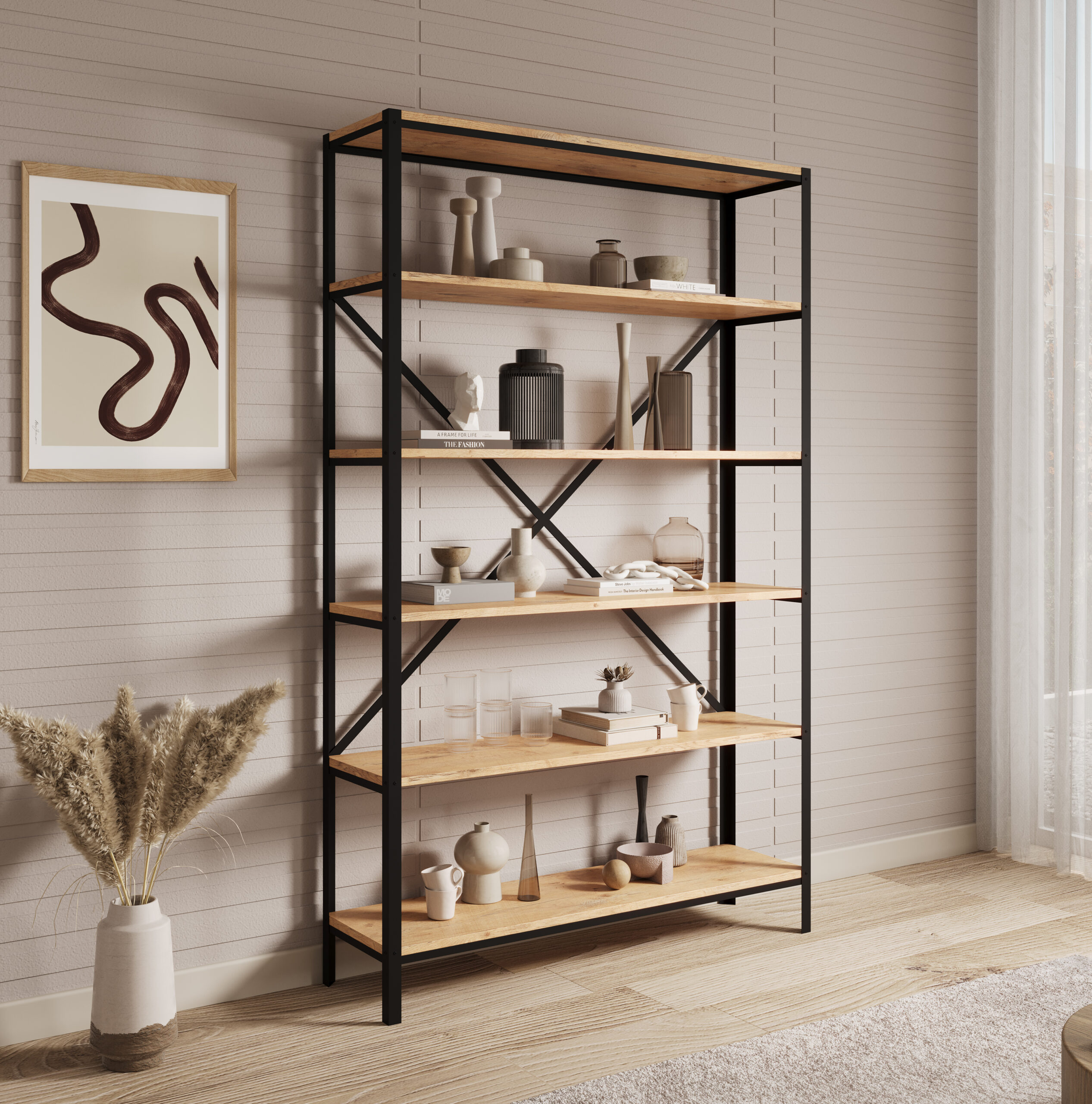 Ha modern/loft stílust szeretsz: fém vázas, fa hatású polcos kialakítás remek választás.