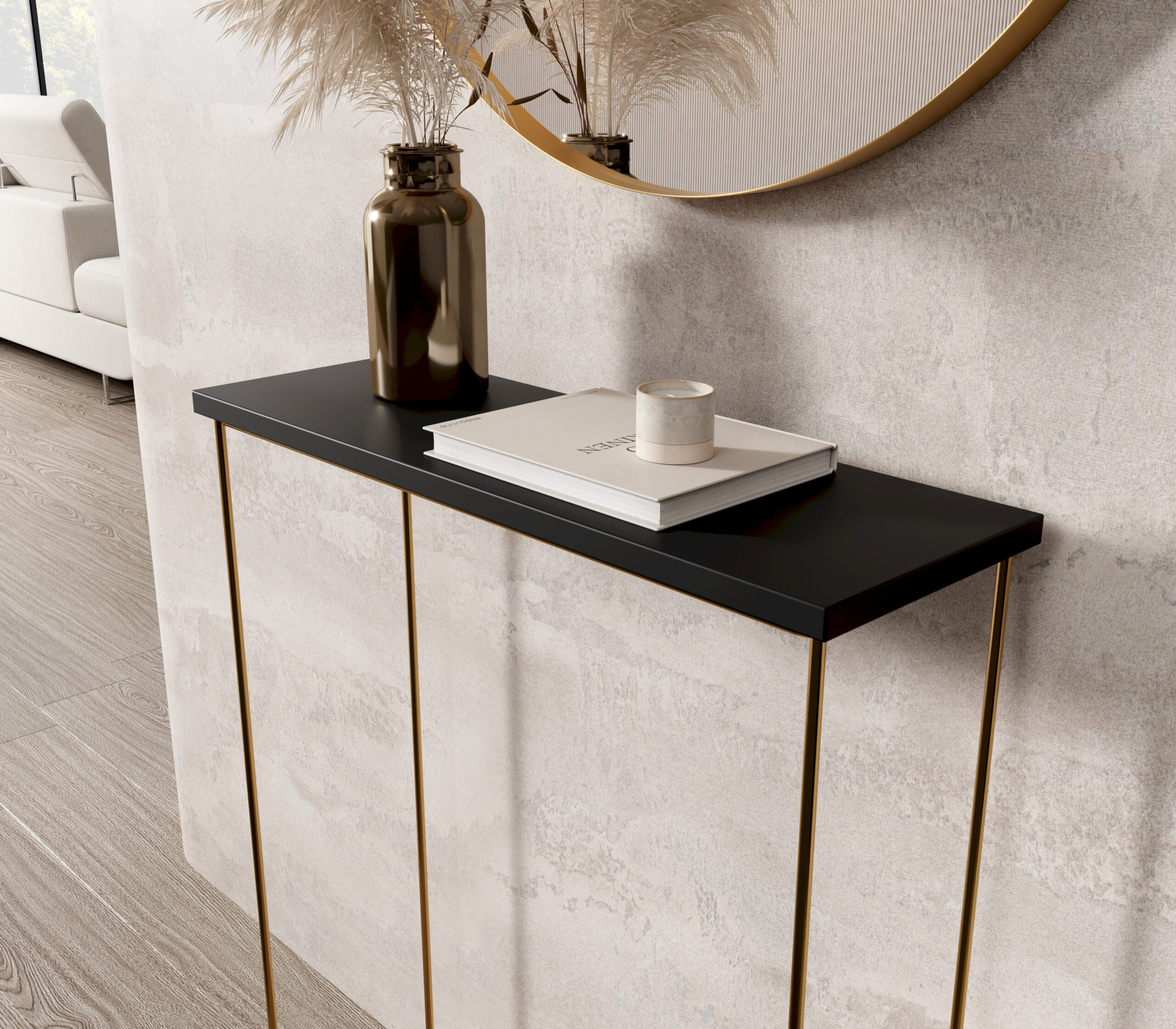Nem szükséges, hogy minden bútor ugyanabból a családból legyen, de jó, ha van egy közös vonal: szín, forma vagy anyag. Ha a nappaliban több fekete részlet van, a konzol is lehet fekete vázas. Ha a lakás inkább meleg, természetes tónusú, akkor egy fa hatású lappal kombinált megoldás kellemesebb. A lényeg az, hogy a konzolasztal ne „idegen tárgy” legyen, hanem illeszkedjen a tér ritmusába.
