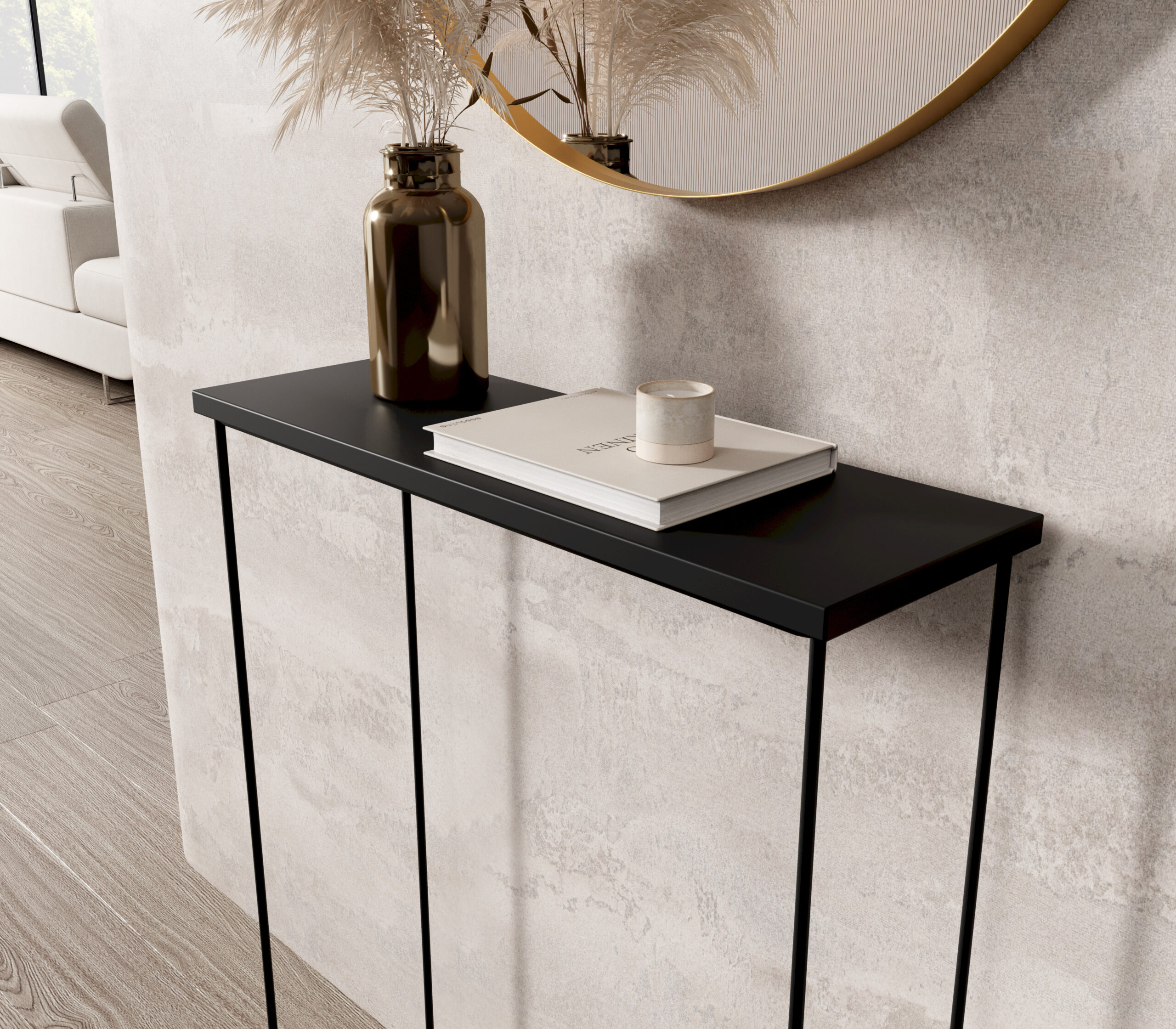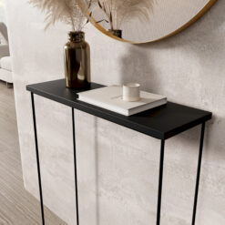 Nem szükséges, hogy minden bútor ugyanabból a családból legyen, de jó, ha van egy közös vonal: szín, forma vagy anyag. Ha a nappaliban több fekete részlet van, a konzol is lehet fekete vázas. Ha a lakás inkább meleg, természetes tónusú, akkor egy fa hatású lappal kombinált megoldás kellemesebb. A lényeg az, hogy a konzolasztal ne „idegen tárgy” legyen, hanem illeszkedjen a tér ritmusába.