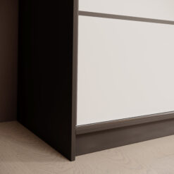 A tolóajtó-rendszernél a sín és a futómechanika kulcsfontosságú. A jó csúszás élménye nem csak „kényelmi extra”: ha simán fut az ajtó, kevésbé kopik, ritkábban szorul be, és hosszabb ideig marad csendes a használat. Ha kétajtós megoldást választasz, fontos, hogy a belső zónák elérését a frontok mozgása ne akadályozza – ezért praktikus a jól osztott belső tér.