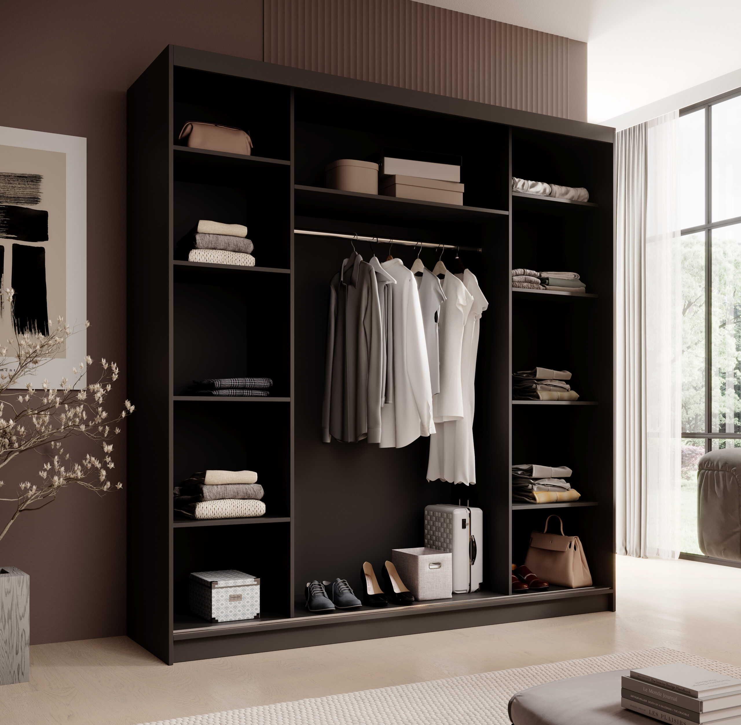 A külső látvány fontos, de a mindennapi használatot a belső elrendezés dönti el. Egy jó gardróbszekrény belül logikusan tagolt: külön zóna van a vállfás ruháknak, külön a hajtogatós daraboknak, és ideális esetben fiókok, polcok és akár kiegészítő tárolók is helyet kapnak.