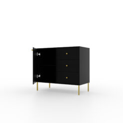 A modern komód sokszor letisztult fronttal, egyszerű vonalakkal, diszkrét fogantyúval vagy nyomásra nyíló megoldással érkezik. Sötétebb árnyalatban (fekete, grafit, sötét tölgy) erős karaktert ad a térnek, de érdemes mellé világos falat, textilt vagy világos padlót társítani, hogy ne legyen túl „nehéz” az összkép.