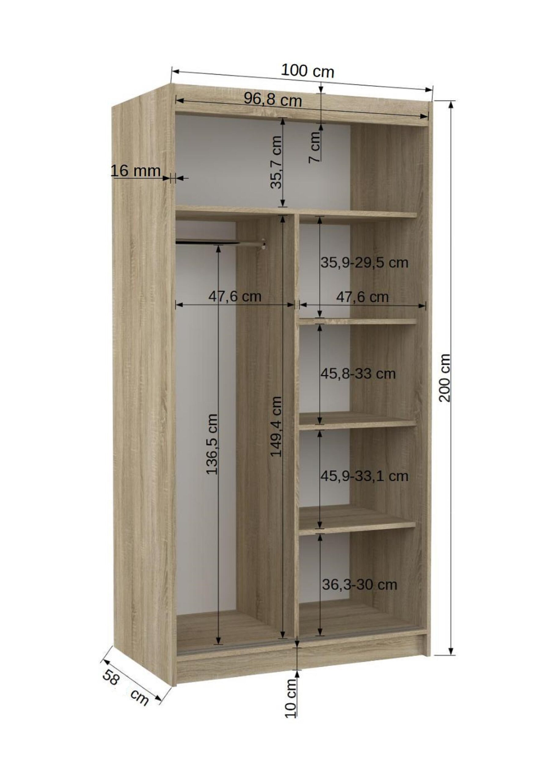 Leírás: Az ASTEN tolóajtós szekrény tökéletes megoldás a tér rendezésére. A bútor tágas polcokkal és ruhásszárítóval van felszerelve, ahol fel tudod akasztani ruháidat, öltönyeidet, külső ruházatodat vagy ingeidet. A tolóajtós kialakításnak köszönhetően nem szükséges külön helyet szánni az ajtónyitásra, így ideális megoldás kis szobák vagy keskeny előszobák számára.