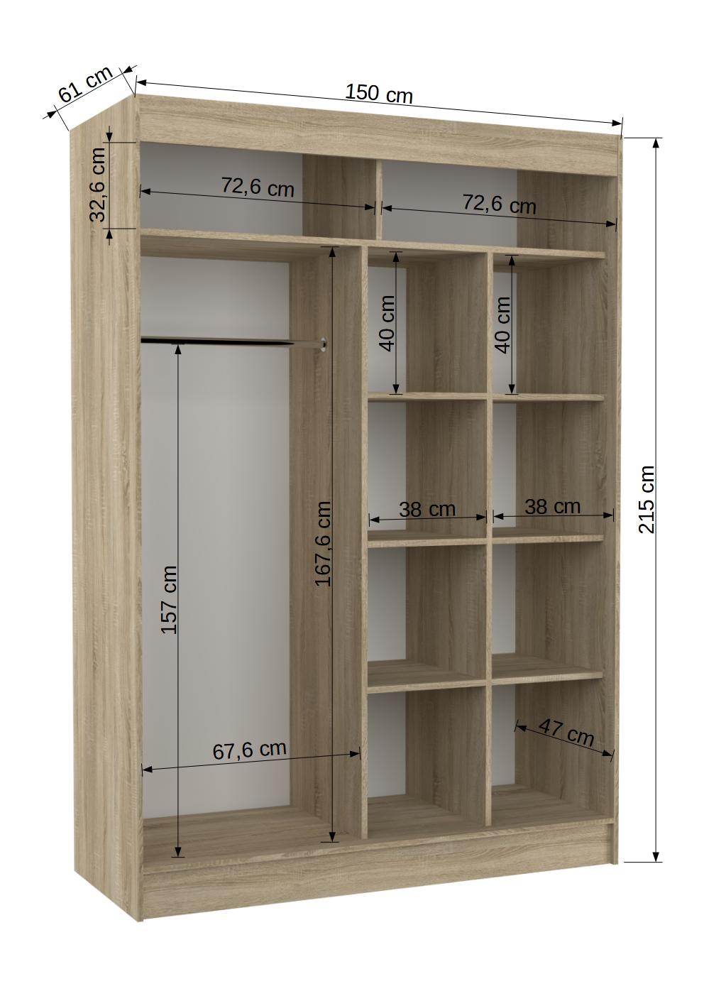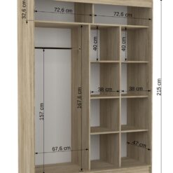 Leírás: A KAREN tolóajtós szekrény ideális megoldás a helykihasználásra. A bútor bőséges polcokkal és ruhásszekrénnyel van felszerelve, ahol ruhákat, öltönyöket, kültéri ruházatot vagy ingeket is felakaszthatsz. Az előlapon lacobelek találhatók, amelyek egyedi stílust kölcsönöznek a bútornak. A tolóajtós kialakításnak köszönhetően nem szükséges extra helyet biztosítani az ajtók kinyitásához, így tökéletes megoldás kis szobákhoz vagy keskeny előszobákhoz.