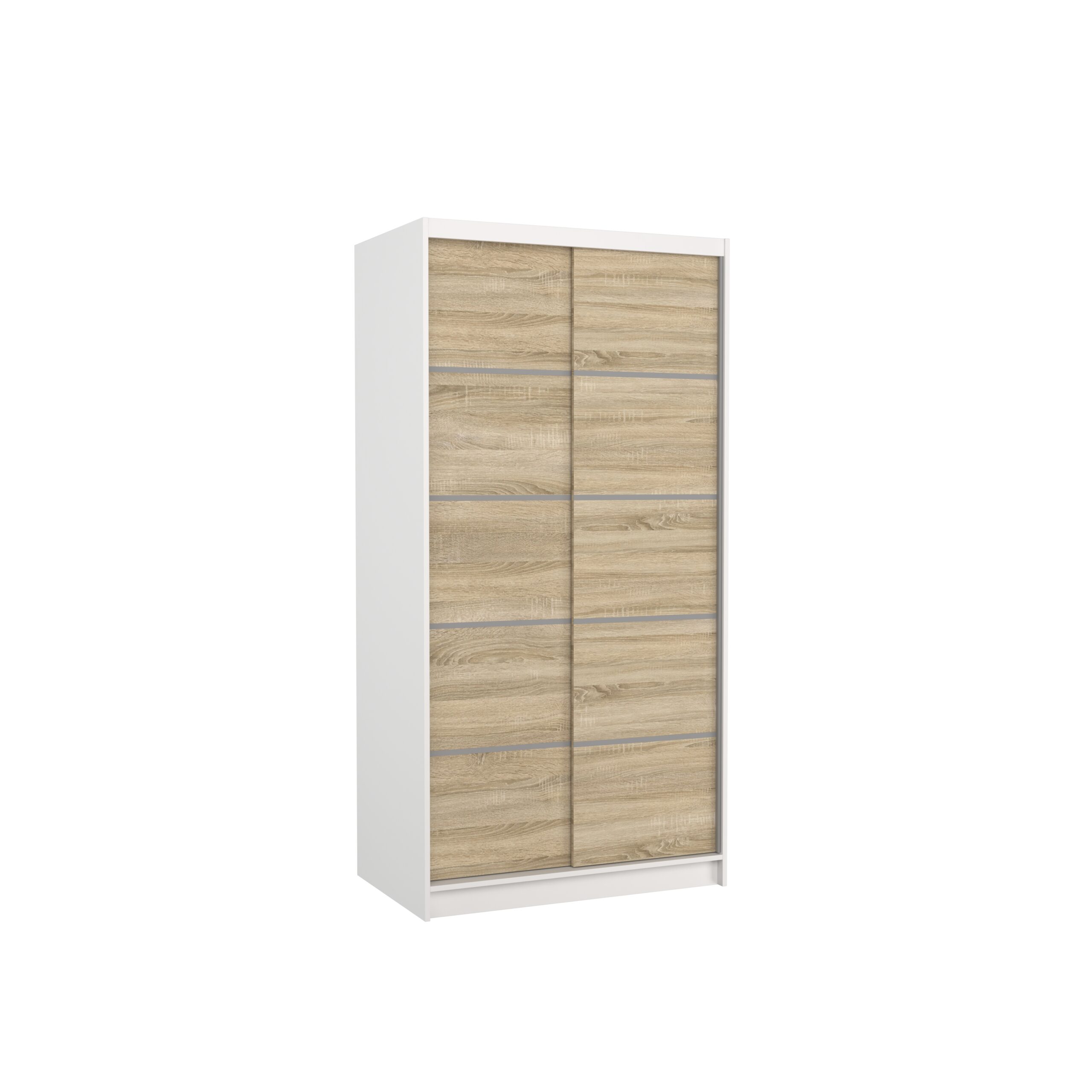 Leírás: A RIVA tolóajtós szekrény ideális megoldás a tér rendezésére. A bútor tágas polcokkal és ruhásszárítóval van felszerelve, ahol fel tudod akasztani ruháidat, öltönyeidet, külső ruházatodat vagy ingeidet. Az előlapján elhelyezett ezüstszínű díszes vízszintes csíkok egyedi stílust kölcsönöznek a bútornak. A tolóajtós kialakításnak köszönhetően nem szükséges külön helyet szánni az ajtónyitásra, így tökéletes megoldás kis szobák vagy keskeny előszobák számára.