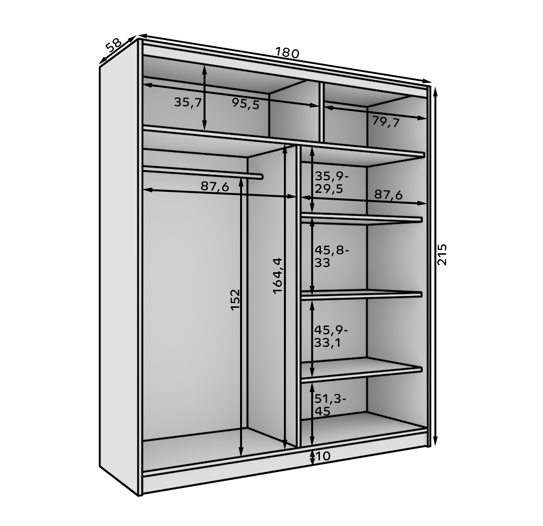 Leírás: A Nico 180 tolószekrény tükörrel elegáns és funkcionális megoldás a modern belső terekbe. Kiváló minőségű, 16 mm vastag laminált lapból készült, így biztosítja a tartósságot és a sérülésekkel szembeni ellenállást. Tágas kialakítású, 180 cm széles, így ideális ruhák és egyéb kiegészítők tárolására. Tükörrel felszerelt tolóajtói optikailag megnövelik a teret, könnyedséget és stílust kölcsönözve a belső térnek. Egyszerű, mégis elegáns kialakításának köszönhetően a szekrény tökéletesen illeszkedik a különböző elrendezésekbe – a klasszikustól a modernig. Funkcionalitás, esztétikum és helytakarékosság teszi kiváló választássá bármely lakásba.
