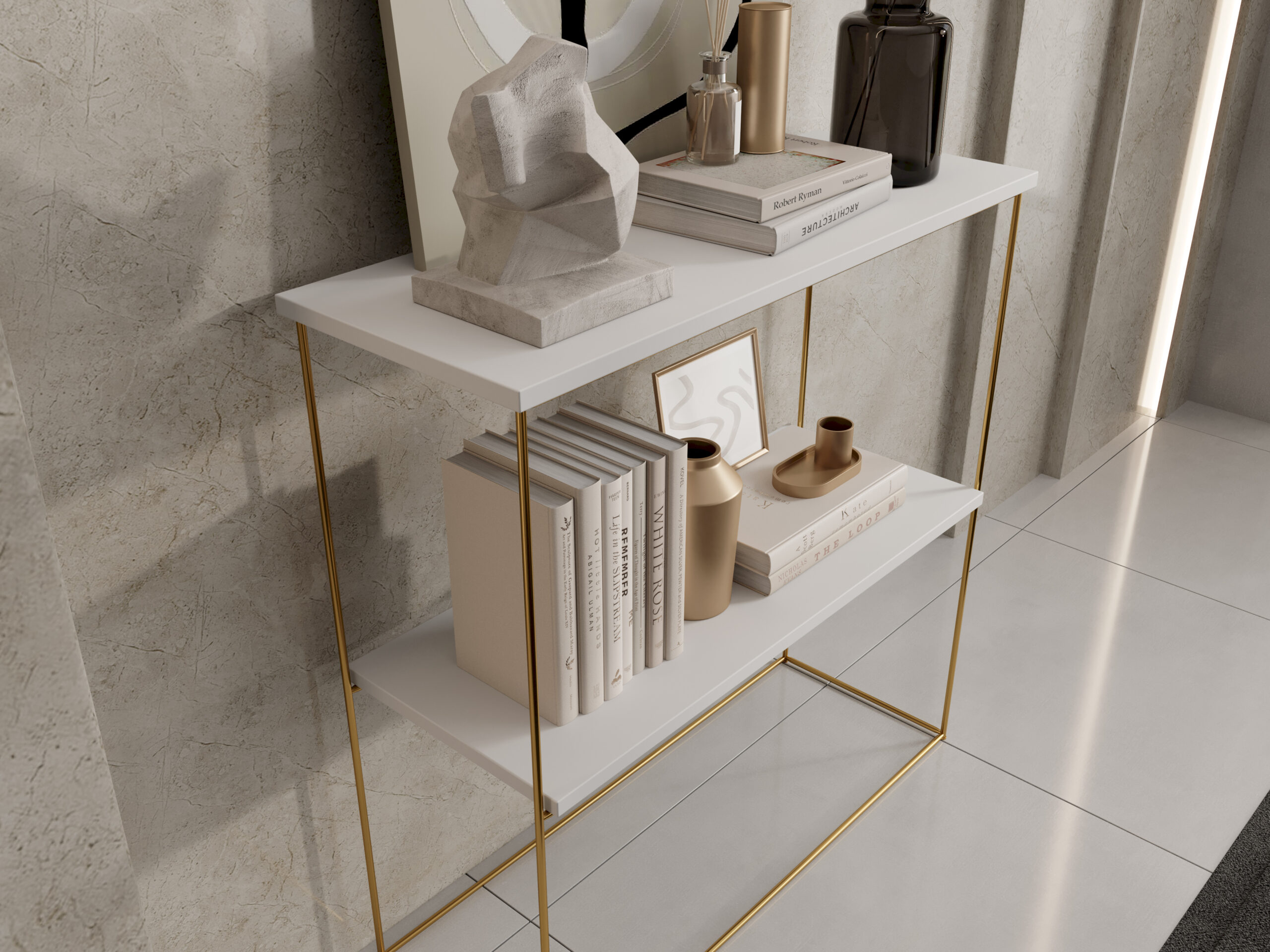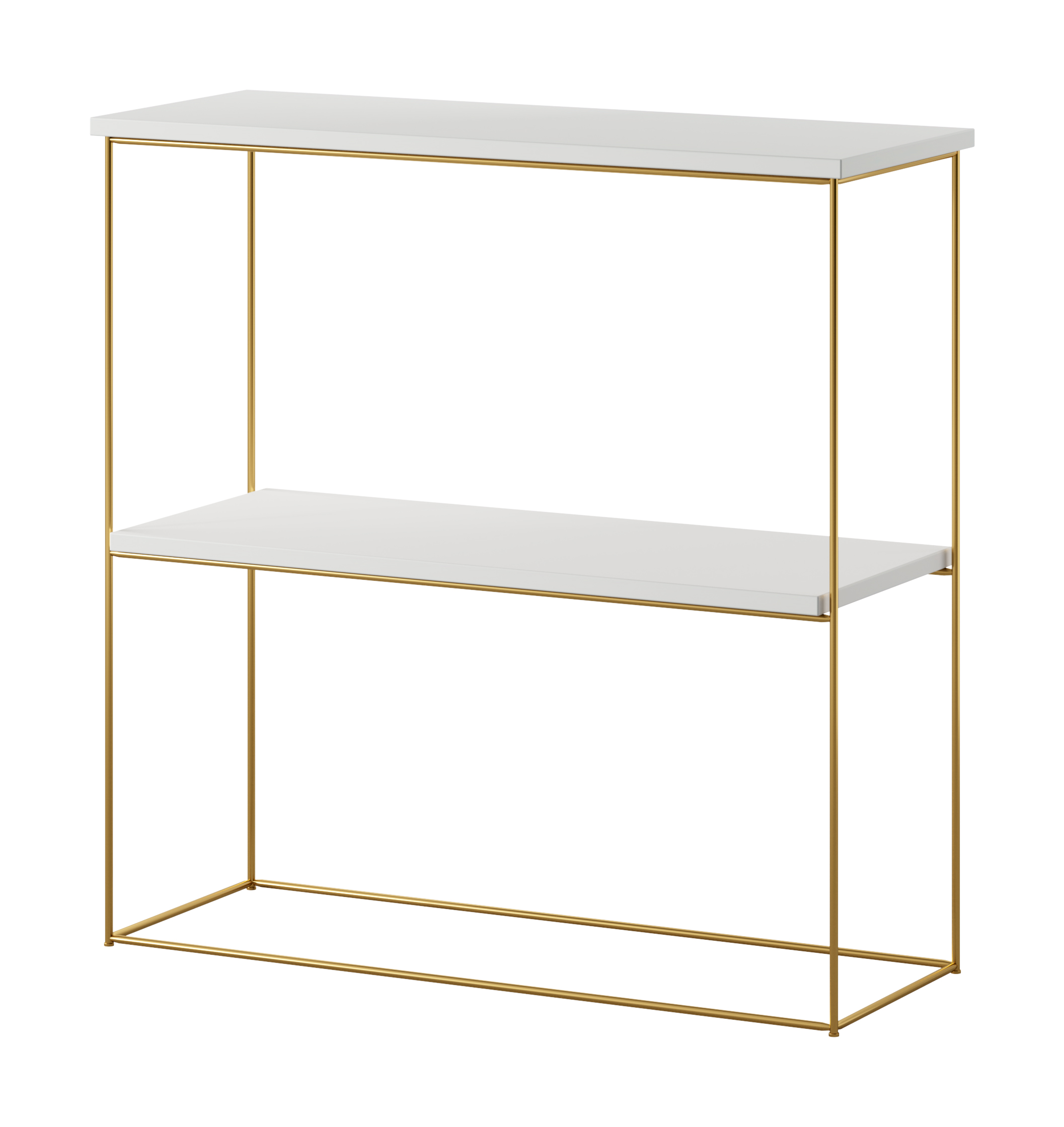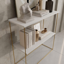 Letisztult formavilágú konzol asztalka, amely fekete polclapokkal és arany fémvázzal harmonikusan illeszkedik modern előszobába vagy nappaliba. Kiválóan alkalmas dekorációk, könyvek vagy kosarak elhelyezésére, miközben könnyed eleganciát visz a térbe