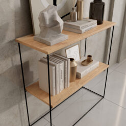 Letisztult formavilágú konzol asztalka, amely fekete polclapokkal és arany fémvázzal harmonikusan illeszkedik modern előszobába vagy nappaliba. Kiválóan alkalmas dekorációk, könyvek vagy kosarak elhelyezésére, miközben könnyed eleganciát visz a térbe