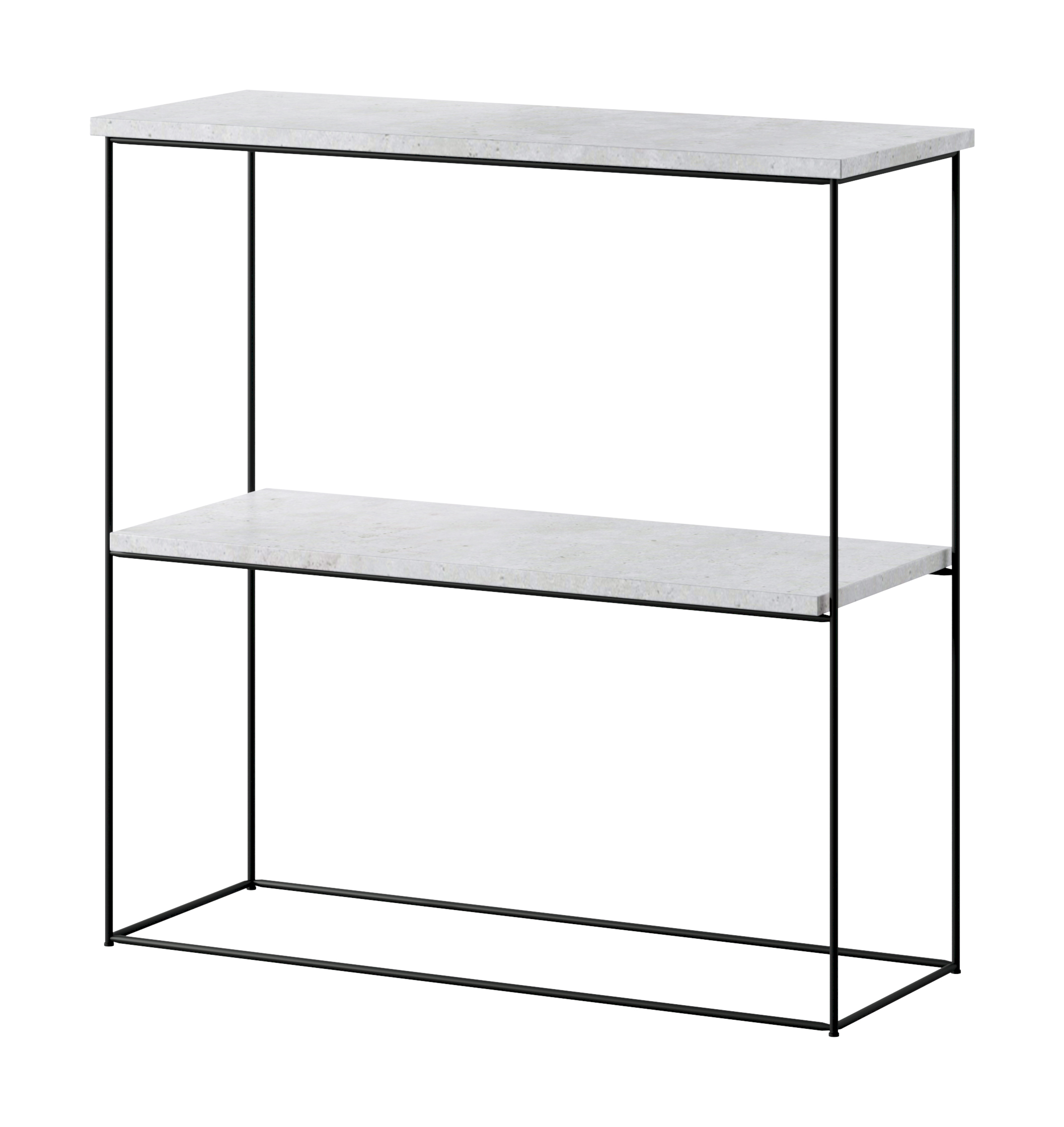 Modern konzol asztalka fehér fém kerettel és fekete tetőlappal; középső polcon kosaras tároló és könyvek, letisztult enteriőrben.