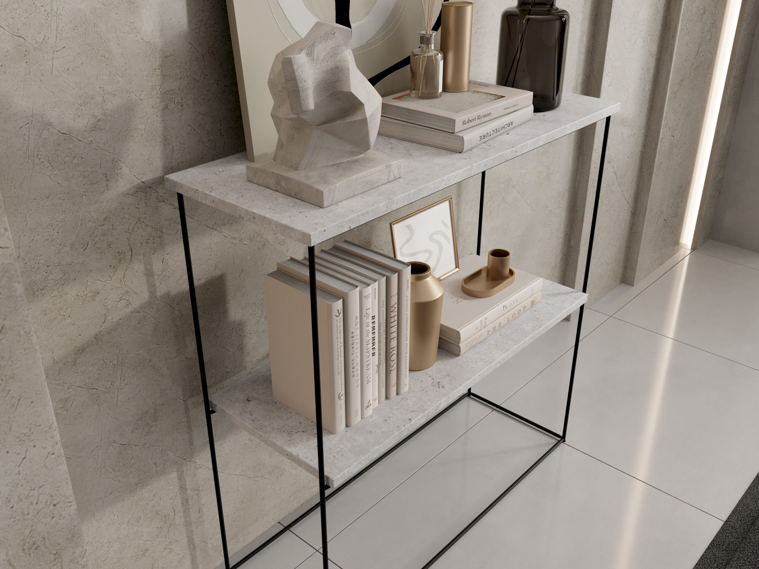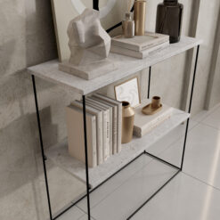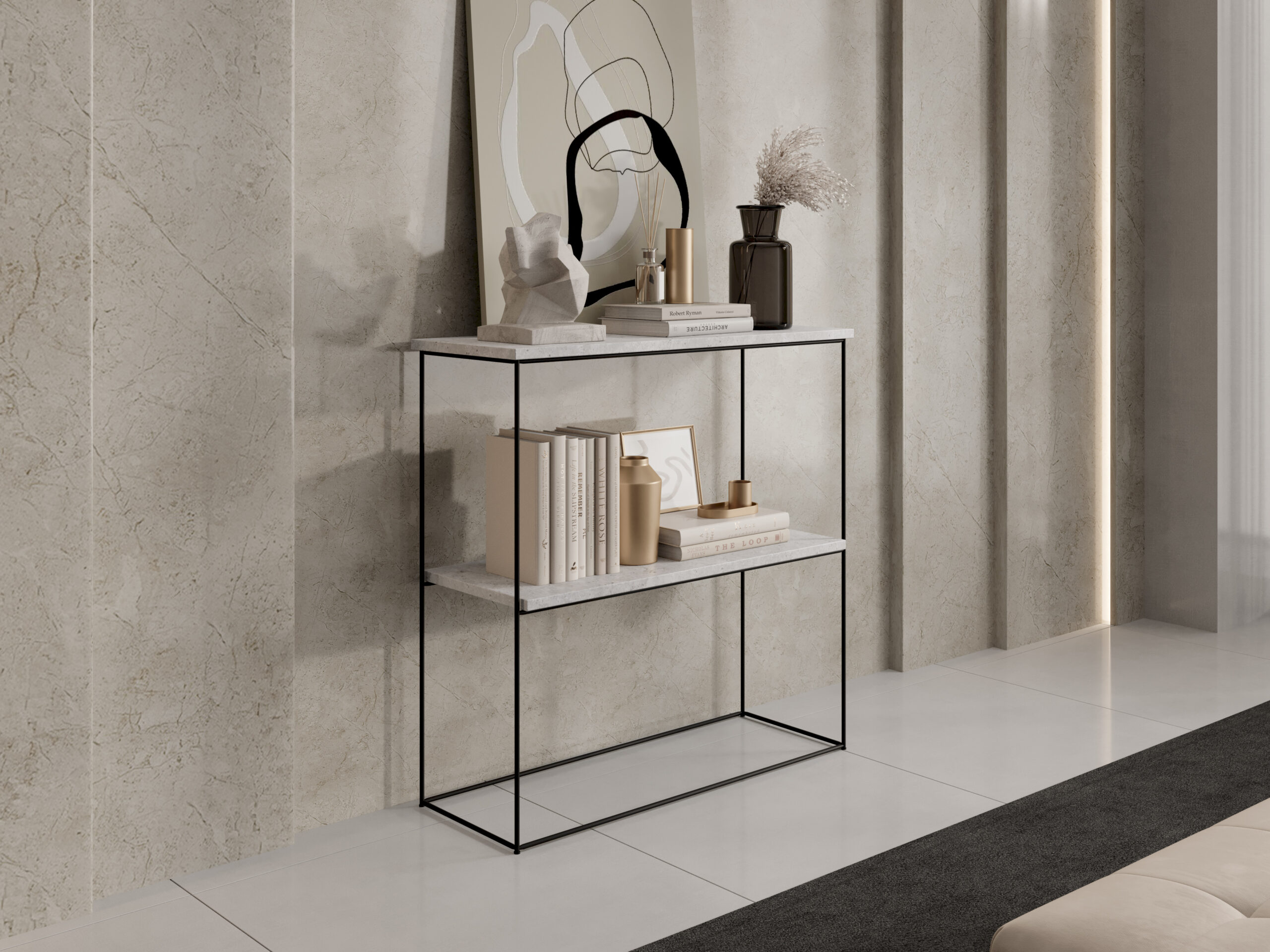 konzol asztalka fekete fém vázzal és két fekete polccal, elegáns nappali enteriőrben dekor kiegészítőkkel