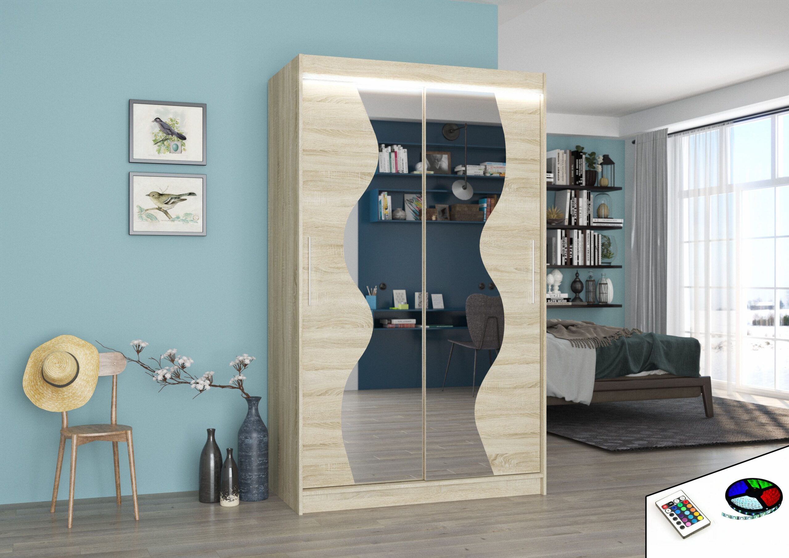 Leírás: Szekrény tolóajtóval és tükörrel OSWALD ideális megoldás a térrendezésre. A bútor tágas polcokkal és ruháztartórúddal van felszerelve, ahol ruhákat, öltönyöket, felsőruházatot vagy ingeket tudsz akasztani. Az előlapon hullám alakú tükröket rögzítettek, amelyek optikailag nagyítják a teret, és egyedi stílust kölcsönöznek neki. A tolóajtós kialakításnak köszönhetően nem kell plusz helyet szánnod az ajtók kinyitására, így tökéletes megoldás kis hálószobák vagy keskeny előszobák számára. Egy vonzó jellemzője az esztétikus LED világítás, ami varázslatos bájt ad a szekrénynek és a helyiségnek egyaránt.