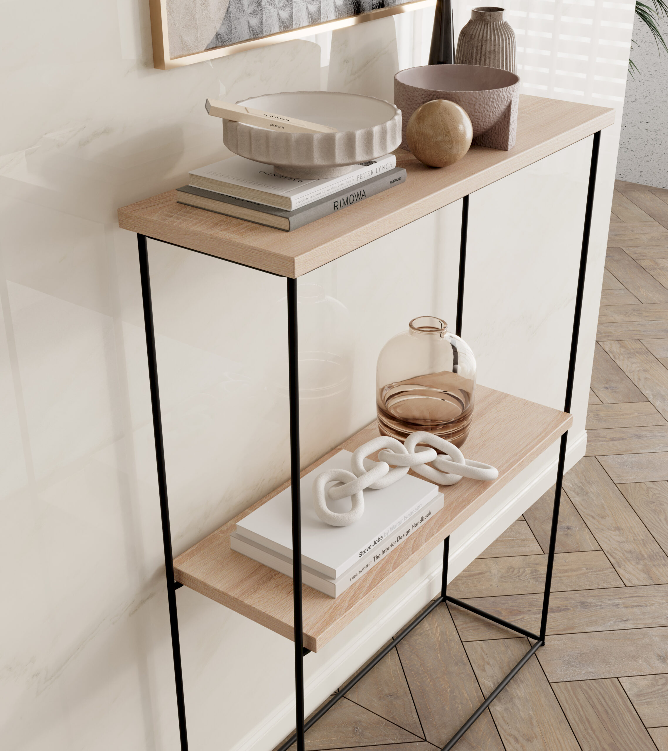 - Nappali fal: kép/poszter + konzolasztal + könyvhalom + dekor váza.