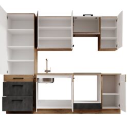 Leírás: A Vika kollekció egy 7 modulból álló konyhai szekrénykészlet, amely lehetővé teszi az összes szükséges konyhai kiegészítő tárolását. A Vika készlet alkalmas sütő beépítésére. A matery és lancelot kombinációja kifejező karaktert kölcsönöz a konyhának, valamint élvezetessé teszi a főzést. A készlet rendelkezik egy olyan munkalappal, amely kiválóan használható a mindennapi használat során. A magas minőségű anyagok használatának köszönhetően a bútorok tartósak és ellenállóak a károsodásokkal szemben.