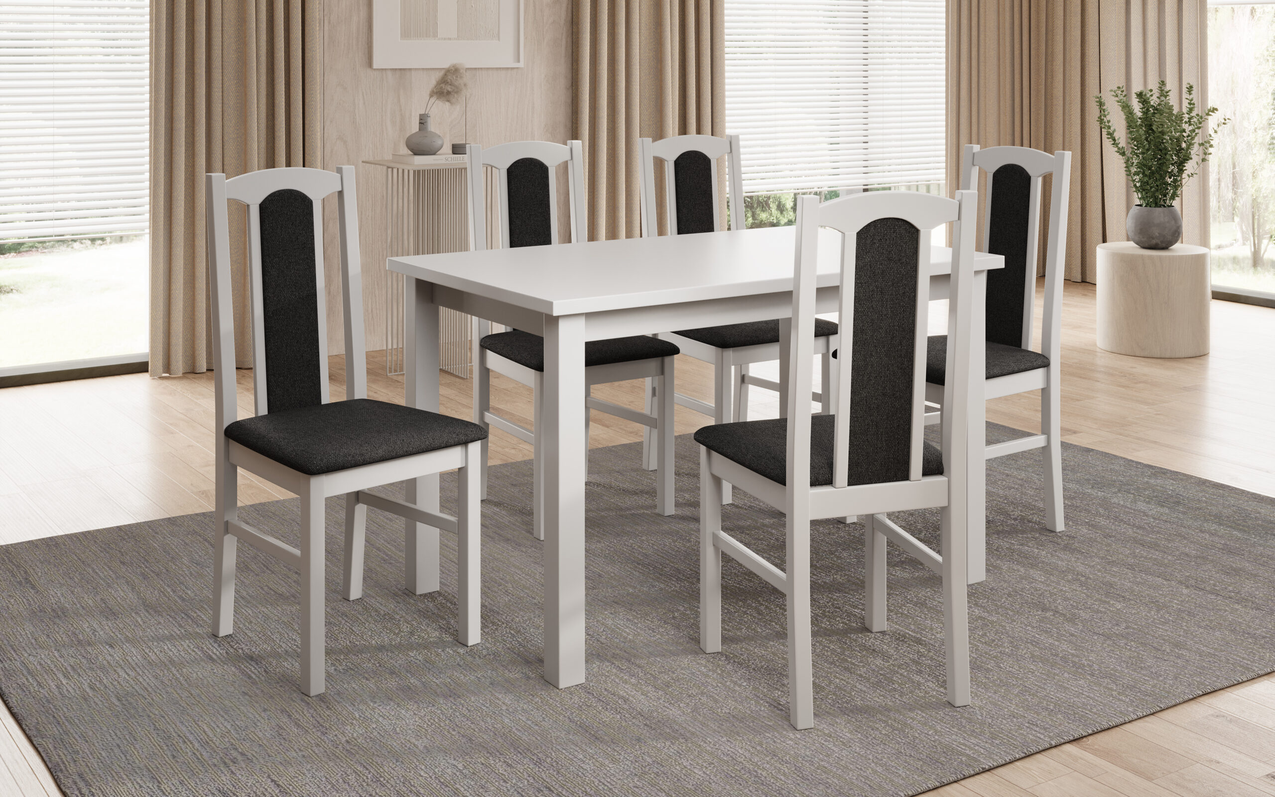 A fekete színű ülőhelyek az egyik legsokoldalúbb választások: világos fa asztallal kontrasztos és modern, sötétebb asztallal pedig elegáns és összefogott. Ha szereted a letisztult, prémium hatást, ez egy stabil “alap”, amit könnyű világítással és kiegészítőkkel felöltöztetni.