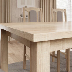 A fa hatású étkező asztal szinte mindenhez passzol: fehér, bézs, szürke, fekete kárpitokkal is jól működik, így az ülőbútor lehet az, amivel finoman változtatsz a hangulaton. Merészebb megoldás, ha az ülőfelület adja a színt (például zöld, kék, terrakotta árnyalat), és az asztal marad semleges.